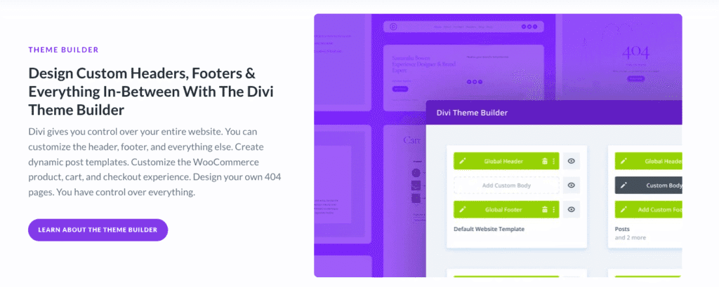 Divi’s Theme Builder applies the same system to the whole site. Creators design headers, footers, single post templates, and archive pages, then set rules for where each one appears, similar to display conditions in other builders. This keeps styling consistent across the site without repeating the same setup on every page.